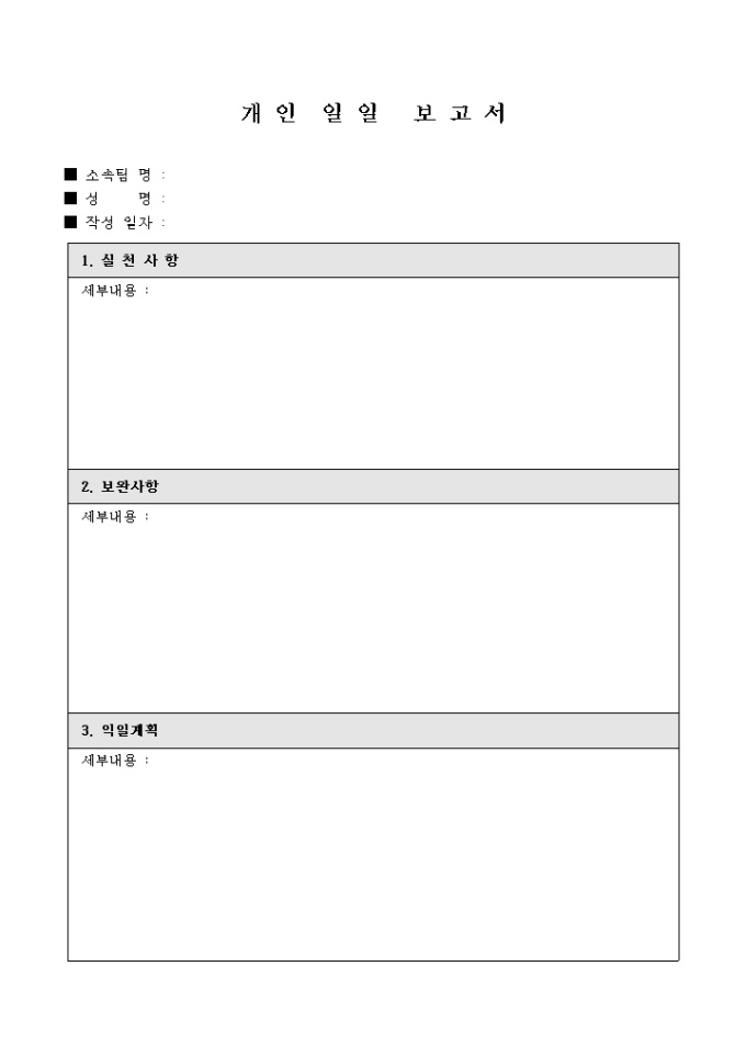9,000원/월개인의 일일업무 보고를 위한 양식으로 소속팀명, 성명, 작성일자, 일일실천사항, 보완사항, 익일계획 등의 내용으로 이루어진 개인 일일 보고서 양식입니다.