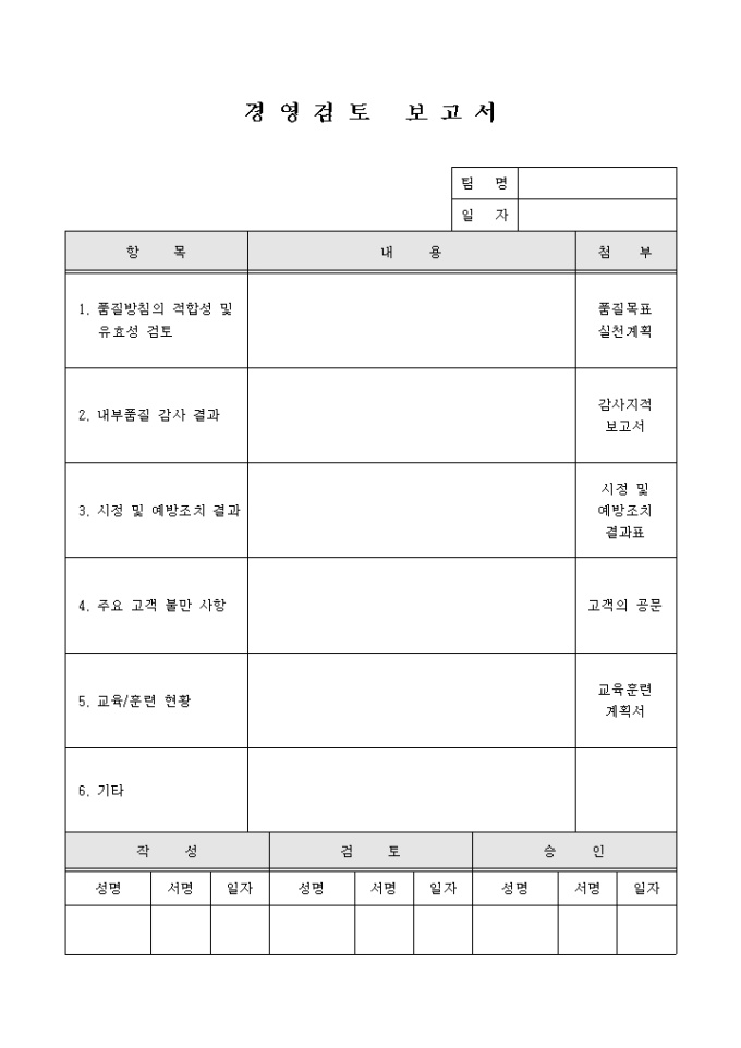 9,000원/월작성부서, 작성일자, 부서, 항목, 문제점, 대책, 대표이사의견, 작성, 검토, 승인 등의 내용으로 구성된 경영검토보고서 양식입니다.