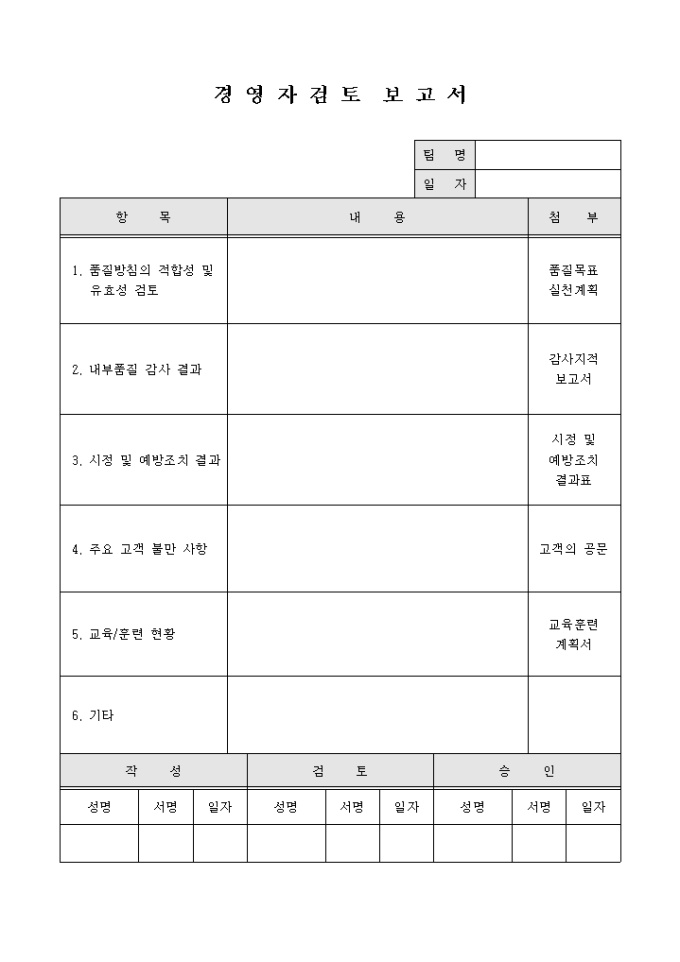 9,000원/월품질방침의 적합성 및 유효성검토, 내부품질감사결과, 시정 및 예방조치 결과, 주요고객불만사항, 교육/훈련현황 등의 항목으로 구성된 경영자 검토보고서 양식입니다.