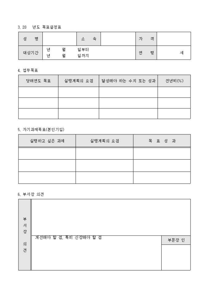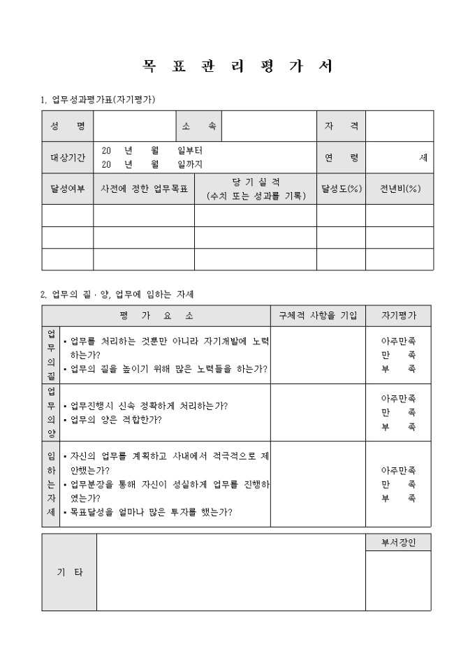 9,000원/월목표관리평가서 양식으로 한해의 업적, 업무의 질(양), 업무에 임하는 자세, 연간 목표설정표, 업무목표, 자기과제목표, 부문장코멘트, 종합평가 등의 내용으로 구성되어져 있습니다.