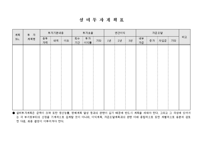 9,000원/월설비투자계획명, 투자기본내용, 투자효율, 연간이익, 자금조달 등으로 구성된 계획표입니다