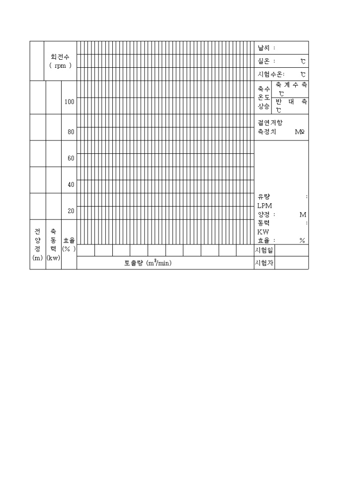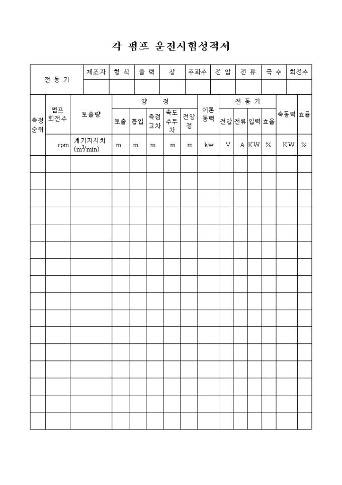 9,000원/월각펌프운전시험성적서 입니다. 측정순위, 펌프회전수, 투출량, 양정, 이론동력, 전동기, 축동력, 효율등의 항목으로 구성된 양식입니다.