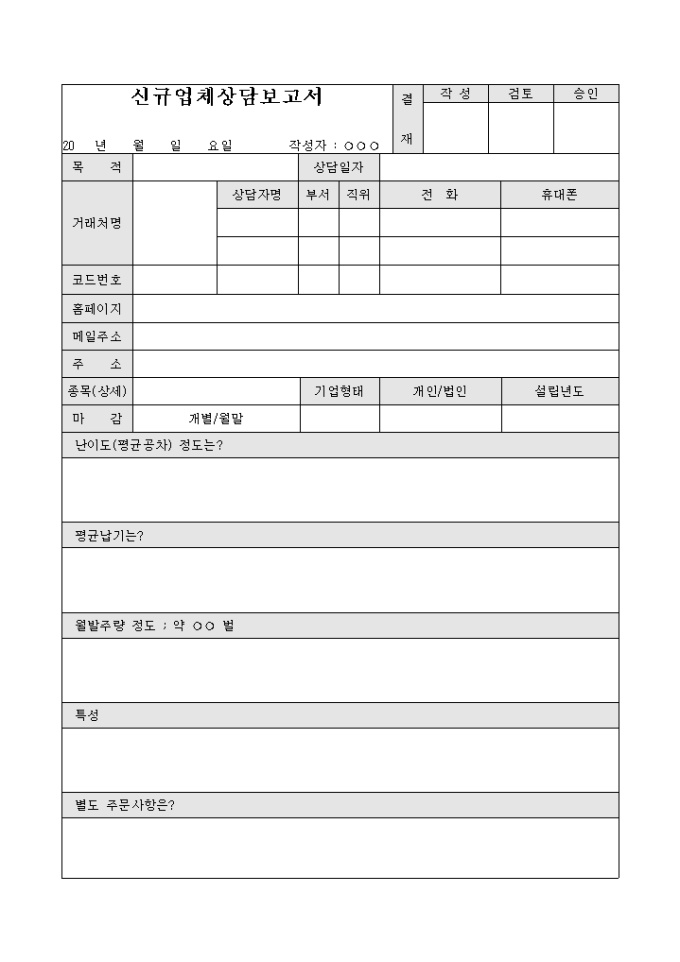 9,000원/월목적, 상담일자, 거래처명 등으로 구성된 신규업체 상담보고서입니다.