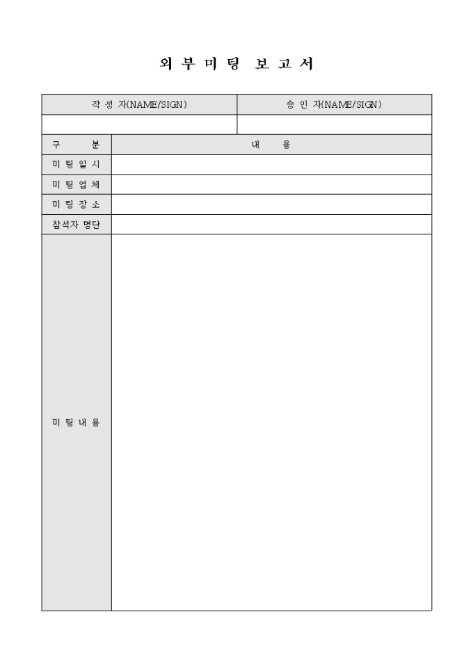 9,000원/월작성자, 승인자 이름과 서명, 미팅일시, 업체, 장소, 참석자 명단 등으로 구성된 외부미팅 보고서입니다.