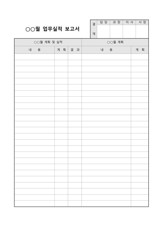 9,000원/월전월의 계획업무 내용 및 결과, 다음월의 계획을 기록할 수 있는 월간 업무실적 보고서입니다.