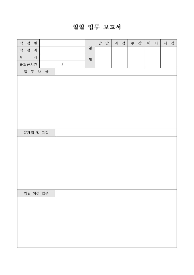 9,000원/월출퇴근 시간, 업무내용, 문제점, 고찰, 익일 예정업무, 특기사항, 수금,지출 내역 등으로 구성된 일일 업무보고서의 작성입니다.