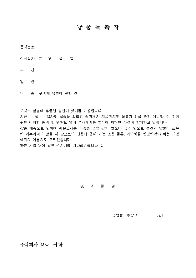 9,000원/월원자재 납품에 관한 지연으로 독촉할 시 사용하는 양식입니다.