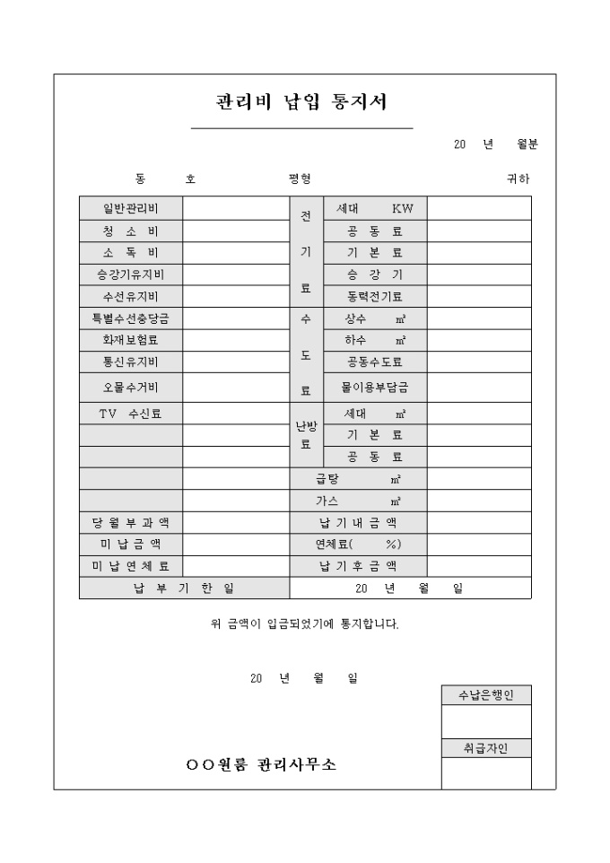 9,000원/월원룸 관리사무소에서 사용하는 관리비 납입 통지서입니다. 관리비 납부 세부내역을 확인할수 있습니다.