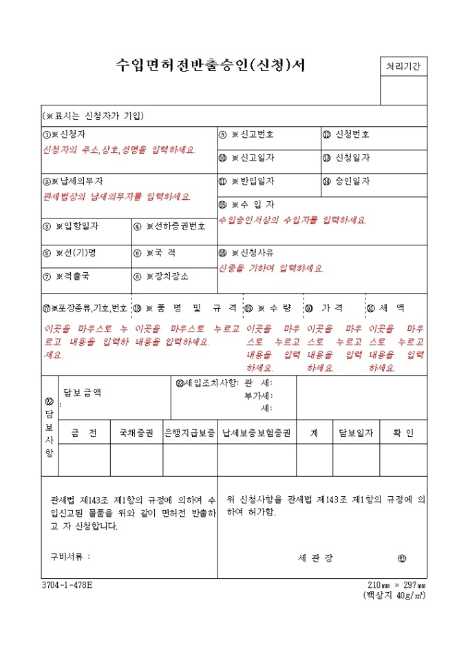 9,000원/월수입면허전반출승인,신청서 양식입니다. 관세법 제143조 제1항의 규정에 의하여 수입신고된 물품을 위와 같이 면허전 반출하고 자 신청하실 경우 사용하시는 양식입니다.