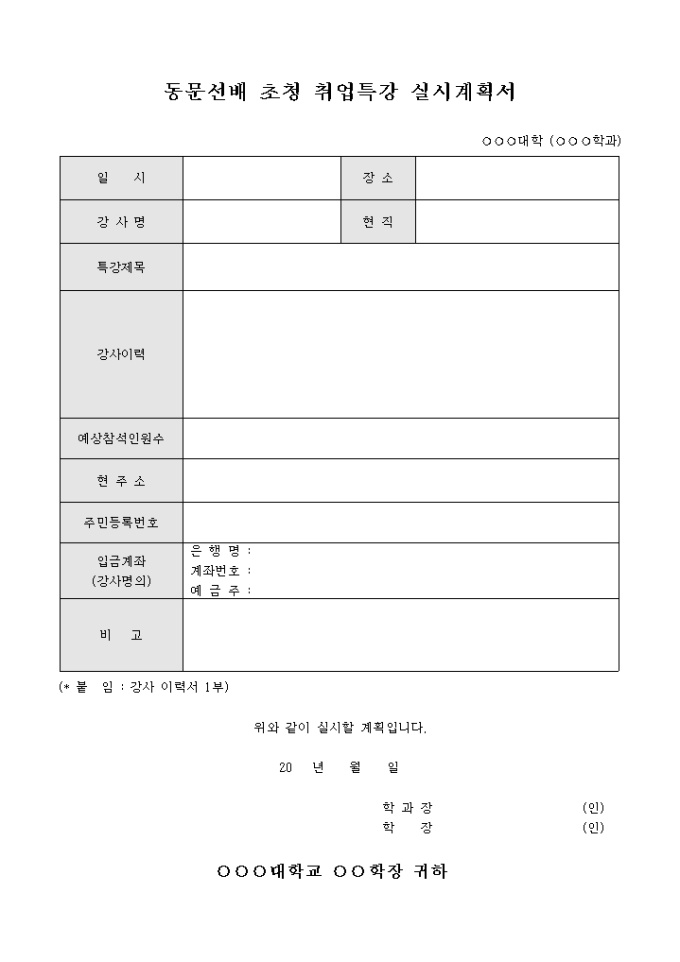 9,000원/월대학내에서 동문선배 초청 취업특강을 하기 위한 특강 실시 계획서 양식입니다. 해당 일시, 장소, 강사명, 현직, 특강제목, 강사이력, 예상참석인원수, 주민등록번호, 강사명의의 입금계좌 등의 항목으로 구성되어 있습니다.