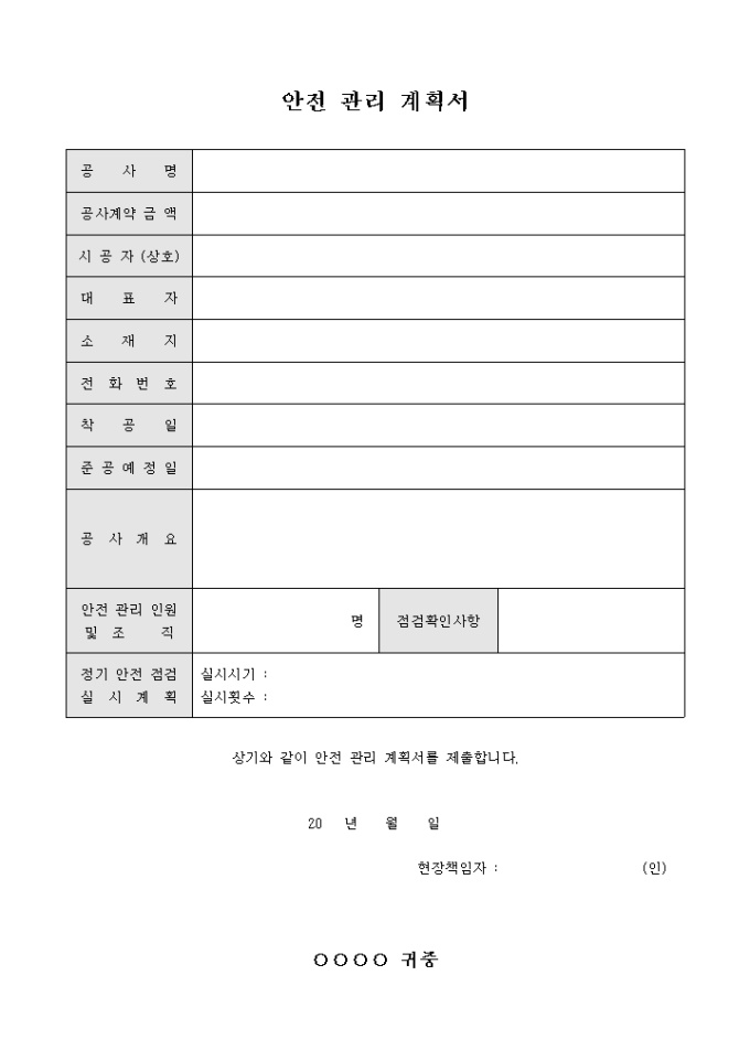 9,000원/월공사명, 공사계약금액, 시공자, 소재지, 착공일, 준공예정일, 공사개요, 안전관리위원, 점검확인사항 등을 기입하여 제출 가능하도록 만든 건설공사 관련 안전관리 계획서입니다.