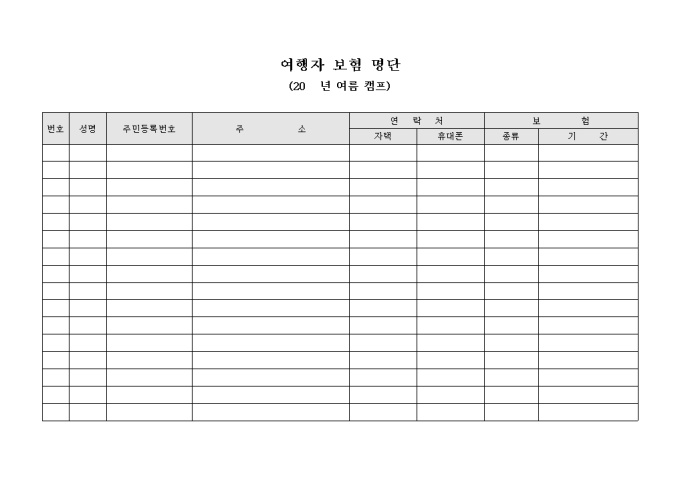 9,000원/월여름 캠프 참여 대상자 중 여행자 보험 가입 대상자의 사항을 기록하기 위해 만들어졌으며 인적사항 및 보험의 종류 등을 기입할 수 있게끔 제작된 서식입니다.