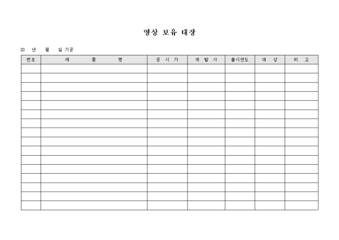 9,000원/월제품명, 공시가, 개발사, 출시연도, 대상의 항목을로 구성된 영상 보유 대장 양식입니다.