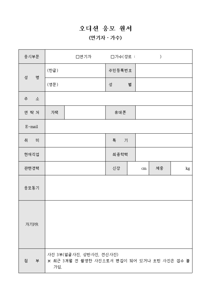 9,000원/월연기자 혹은 가수 오디션에 응모하고자 하는 사람들을 위해 만들어진 서식으로써 자기 PR을 서술형태로 작성할 수 있도록 제작된 서식입니다.