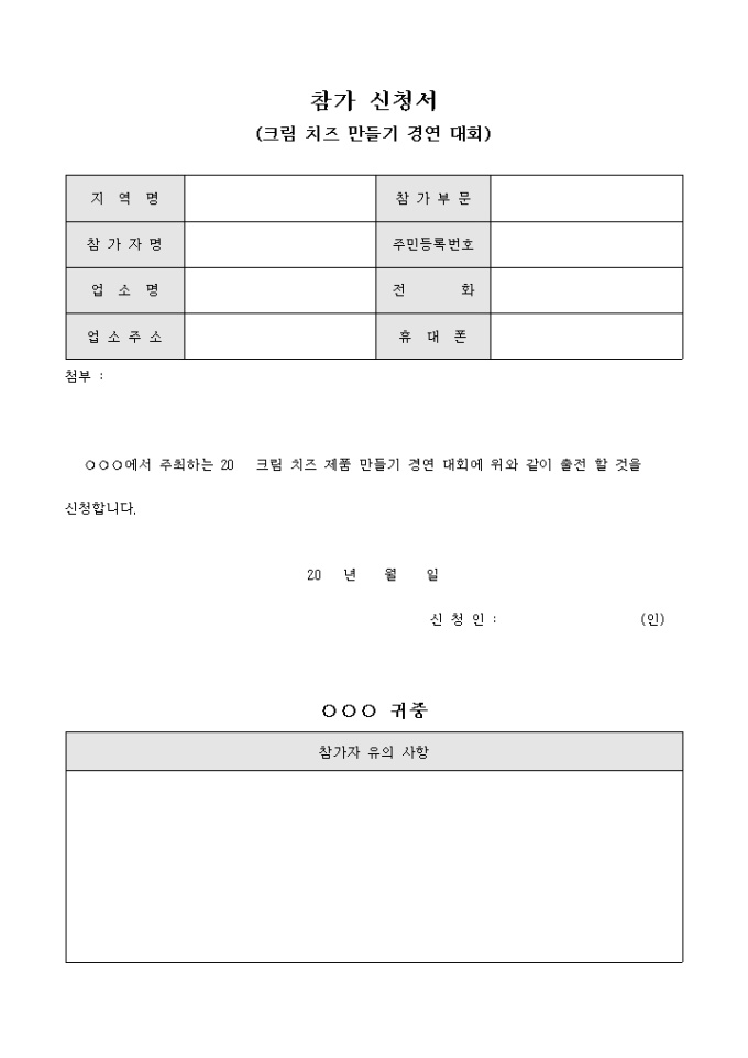 9,000원/월지역명, 참가부문, 참가자명, 주민등록번호, 업소명, 업소주소, 전화, 휴대폰의 사항을 기입하여 제출하는 크림 치즈 제품 만들기 경연대회 참가 신청서 양식입니다.