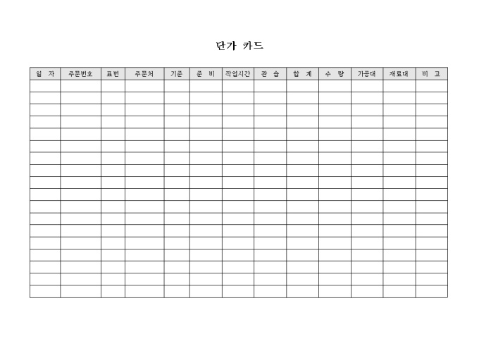 9,000원/월일자별로 주문번호, 표번, 주문처, 준비, 작업시간, 관습, 합계, 수량, 가공대, 재료대 등의 항목을 기재할 수 있는 단가 카드 양식입니다.