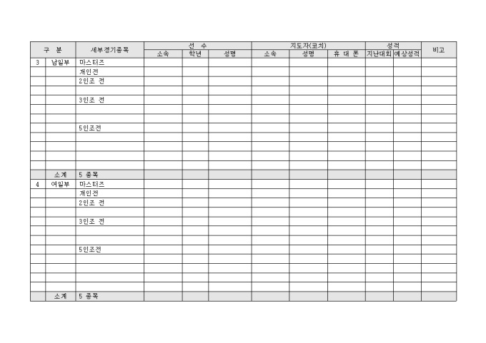 9,000원/월볼링 부원중 하계(동계) 강화훈련에 참가하는 선수와 지도자의 명단을 관리하기 위해 만들어졌으며 종목별로 구분이 가능하며 지난대회 성적과 이번대회 예상 성적을 기입할 수 있게끔 제작된 서식입니다.