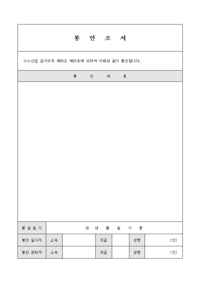 9,000원/월회사의 감사규칙에 따라 감사 내용을 봉인하기 위한 봉인조서 양식입니다. 봉인내용과 봉인일시, 봉인 실시자와 관리자의 소속/직급/성명 등을 기재할 수 있습니다.