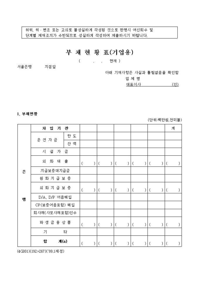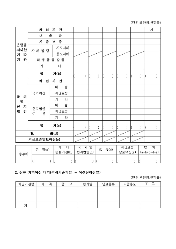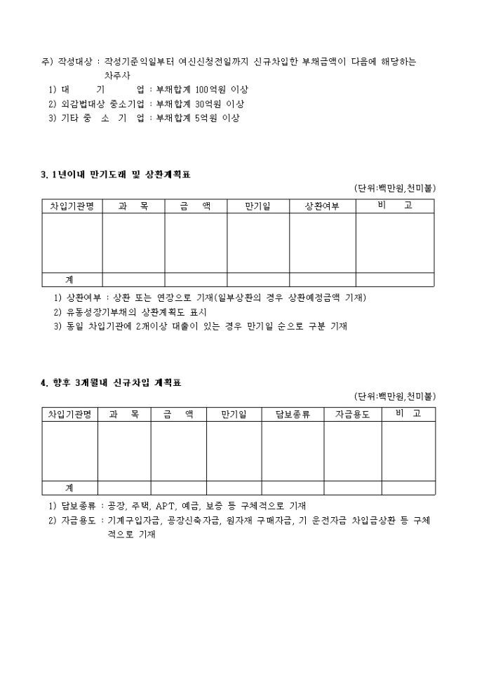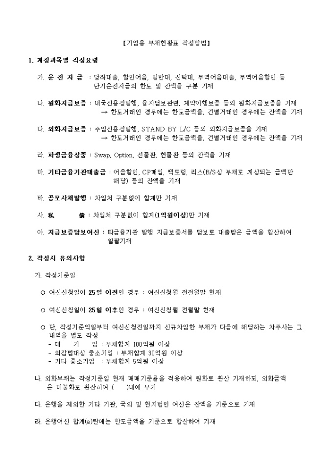 9,000원/월부채현황표(기업용) 양식 입니다. [목 차] 1. 부채현황 2. 신규 거액여신 내역(작성기준익일 ~ 여신신청전일) 3. 1년이내 만기도래 및 상환계획표 4. 향후 3개월내 신규차입 계획표 [기업용 부채현황표 작성방법] 1. 계정과목별 작성요령 가. 운 전 자 금 : 당좌대출, 할인어음, 일반대, 신탁대, 무역어음대출, 무역어음할인 등 단기운전자금의 한도 및 잔액을 구분 기재 나. 원화지급보증 : 내국신용장발행, 융자담