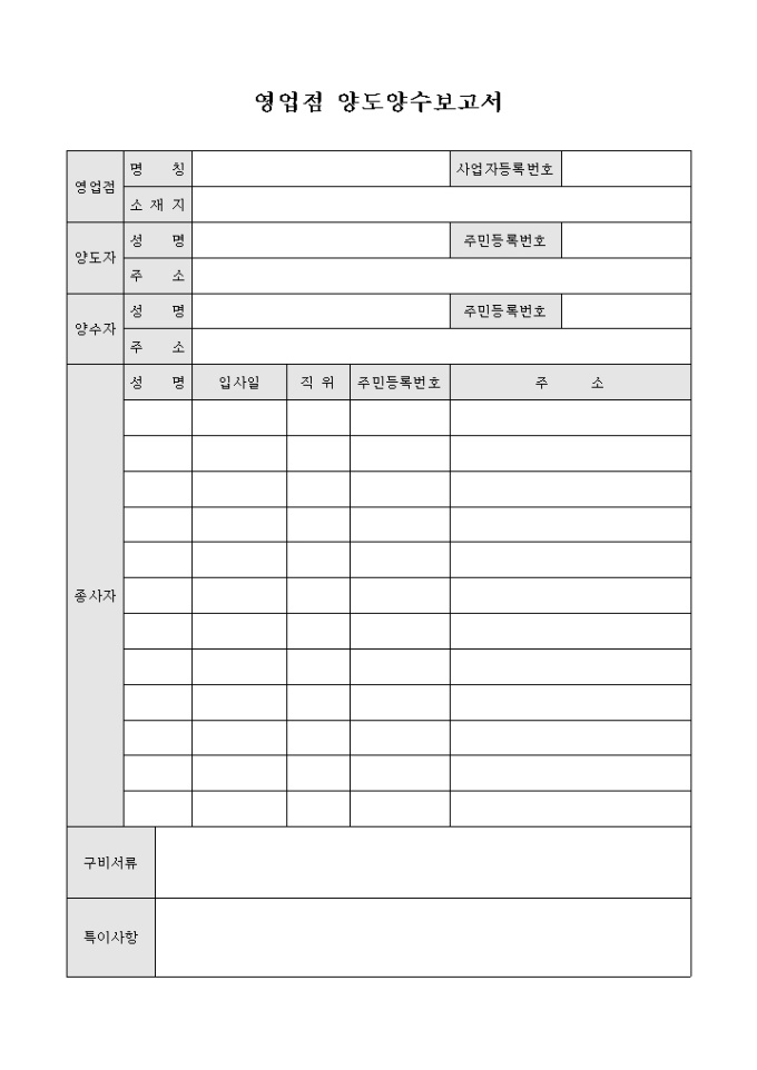 9,000원/월영업점의 양도, 양수와 관련되어 이를 보고하고자 할 때 사용할 수 있도록 만들어졌으며 영업점의 개괄적인 사항, 영업점에 종사하는 종업원의 인적사항 등을 기재할 수 있게끔 제작된 서식입니다.