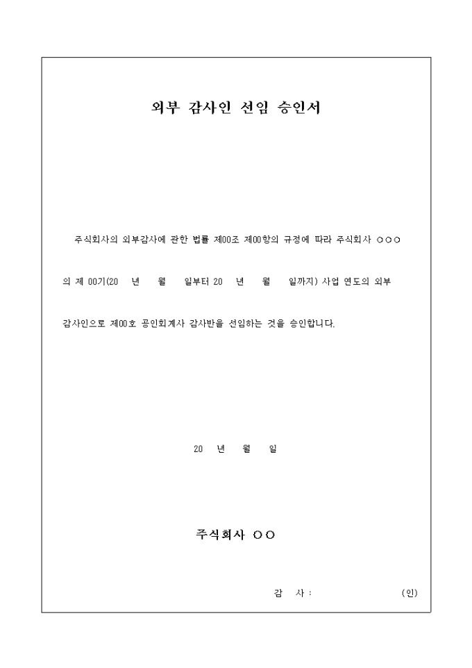9,000원/월외부감사에 관한 법률에 따라 외부 감사인의 선임을 승인한다는 내용의 외부 감사인 선임 승인서 양식입니다.