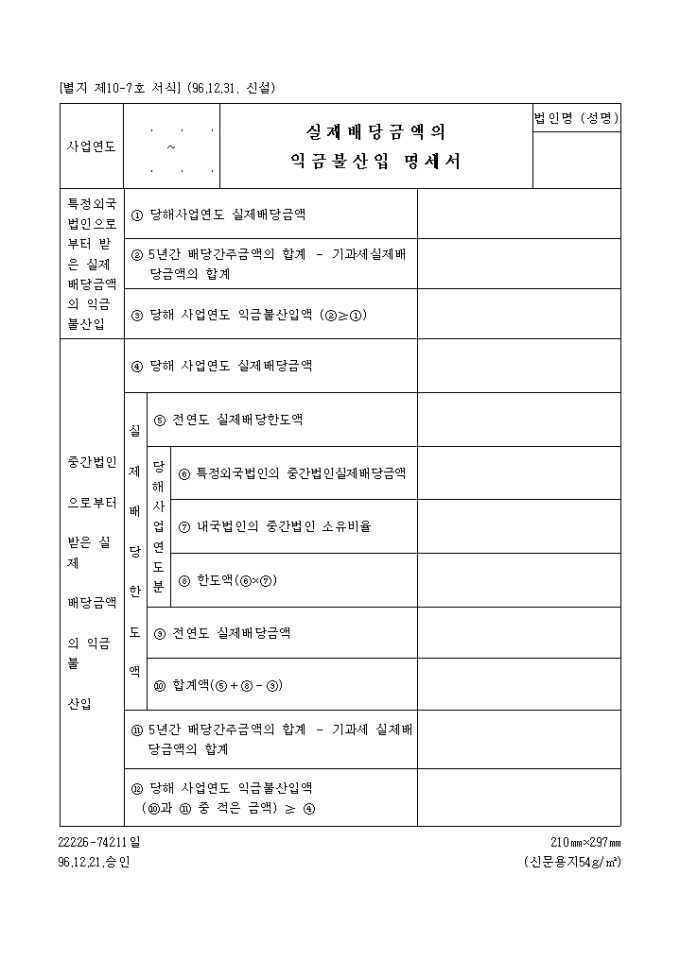9,000원/월[별지 제10-7호 서식] 실제배당금액의익금불산입명세서 양식입니다. 1. 특정외국법인으로부터 받은 실제배당금액의 익금불산입 2. 중간법인으로 부터 받은 실제 배당금액의 익금불 산입의 세부항목으로 구성된 양식입니다.