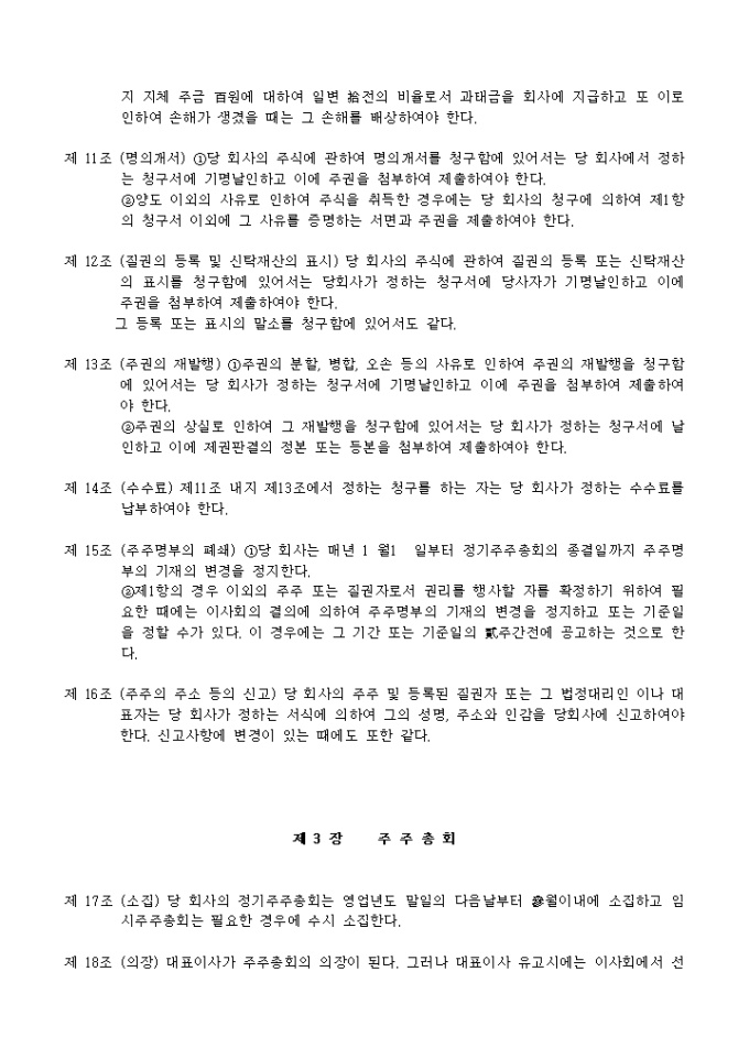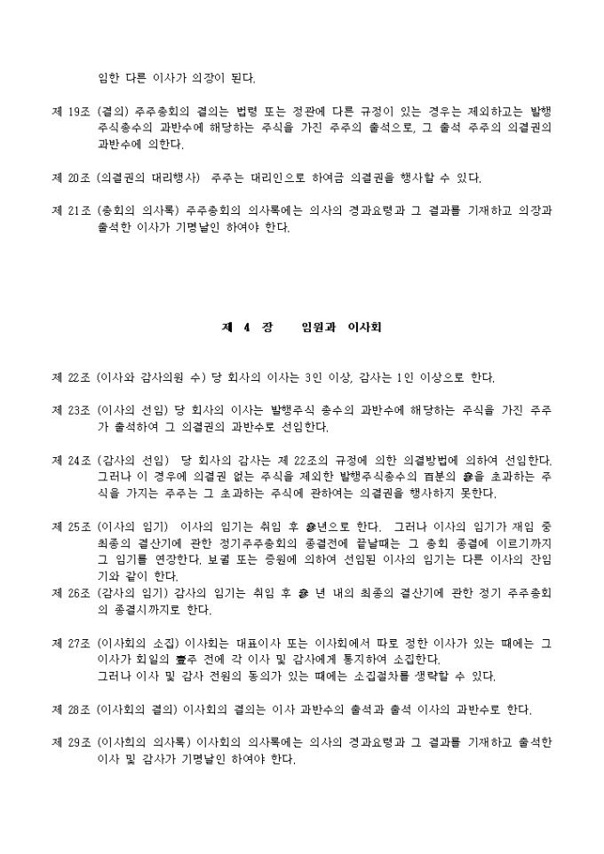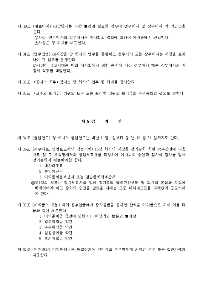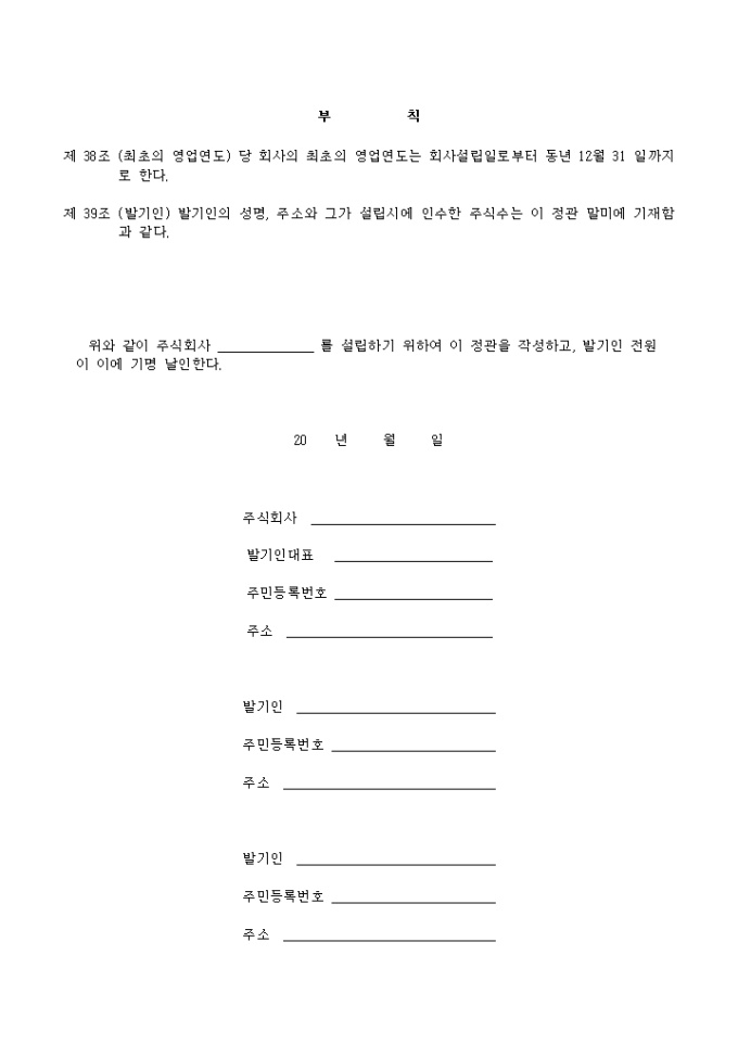 9,000원/월정관양식으로 목차는 다음과 같으니 참고하시기 바랍니다. 1.총칙 2.주식 3.주주총회 4.임원과 이사회 5.계산 6.부칙