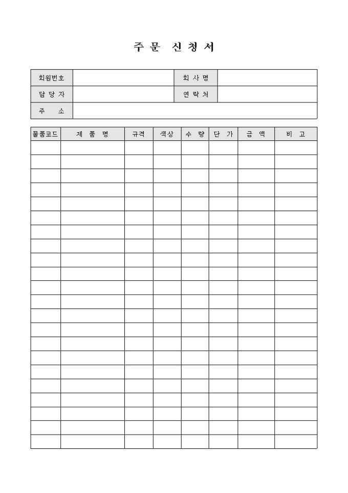 9,000원/월필요한 제품의 규격, 색상, 수량, 단가, 금액 등의 사항을 작성하여 제품을 주문하는 주문 신청서 서식입니다.