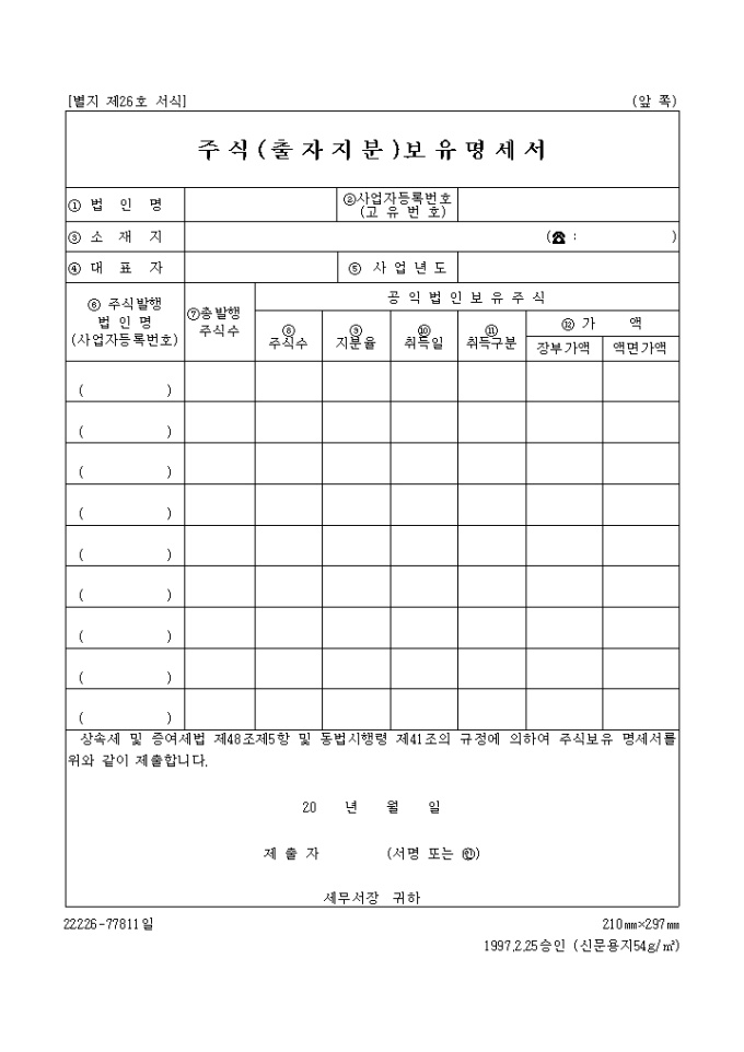 9,000원/월[별지 제26호 서식] 주식,출자지분보유명세서 양식입니다. 상속세 및 증여세법 제48조제5항 및 동법시행령 제41조의 규정에 의하여 주식보유 명세서를 위와 같이 제출하실때 사용하는 양식입니다.