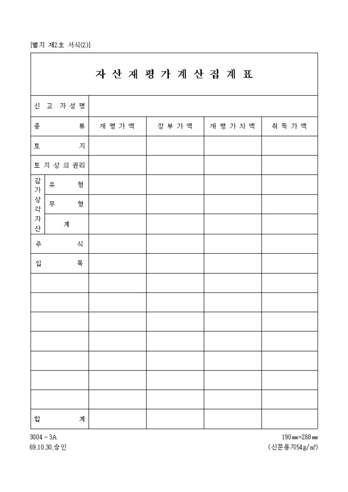 9,000원/월[별지 제2호 서식(2)] 자산재평가계산집계표 양식입니다. 재평가액, 장부가액, 재평가가차액, 취득가액의항목으로 구성된 양식입니다.