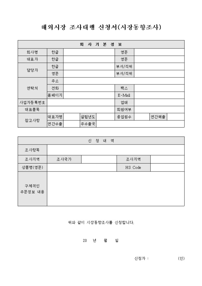 9,000원/월해외시장에 대한 조사를 대행해 줄 것을 신청하는 해외시장 조사대행 신청서 양식입니다. 조사를 신청한 회사의 기본정보 사항과 조사하고자 하는 신청내역 등을 기재할 수 있습니다.