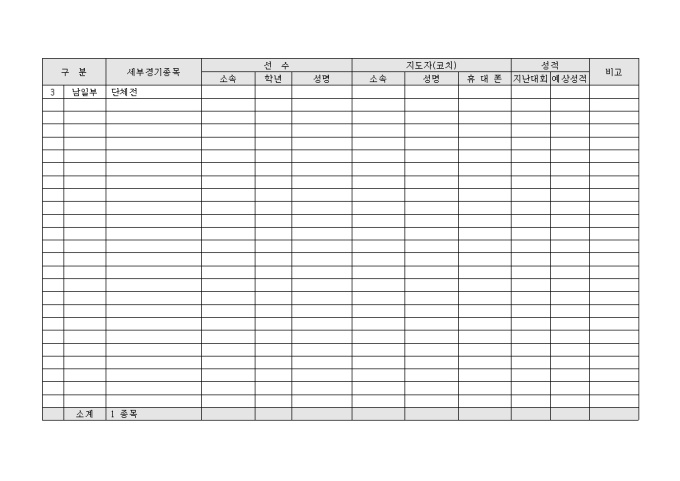 9,000원/월핸드볼 부원중 하계(동계) 강화훈련에 참가하는 선수와 지도자의 명단을 관리하기 위해 만들어졌으며 종목별로 구분이 가능하며 지난대회 성적과 이번대회 예상 성적을 기입할 수 있게끔 제작된 서식입니다.