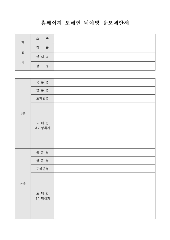 9,000원/월홈페이지 도메인 네이밍 응모 제안시 사용하는 문서입니다. 제안자의 정보와 2가지 제안에 대한 내용 기록이 가능합니다.