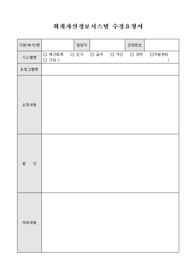 9,000원/월회계자산 정보시스템의 수정 요청시 사용하는 문서입니다. 수정요청 내용과 원인 및 처리 내용을 기록 할 수 있습니다.