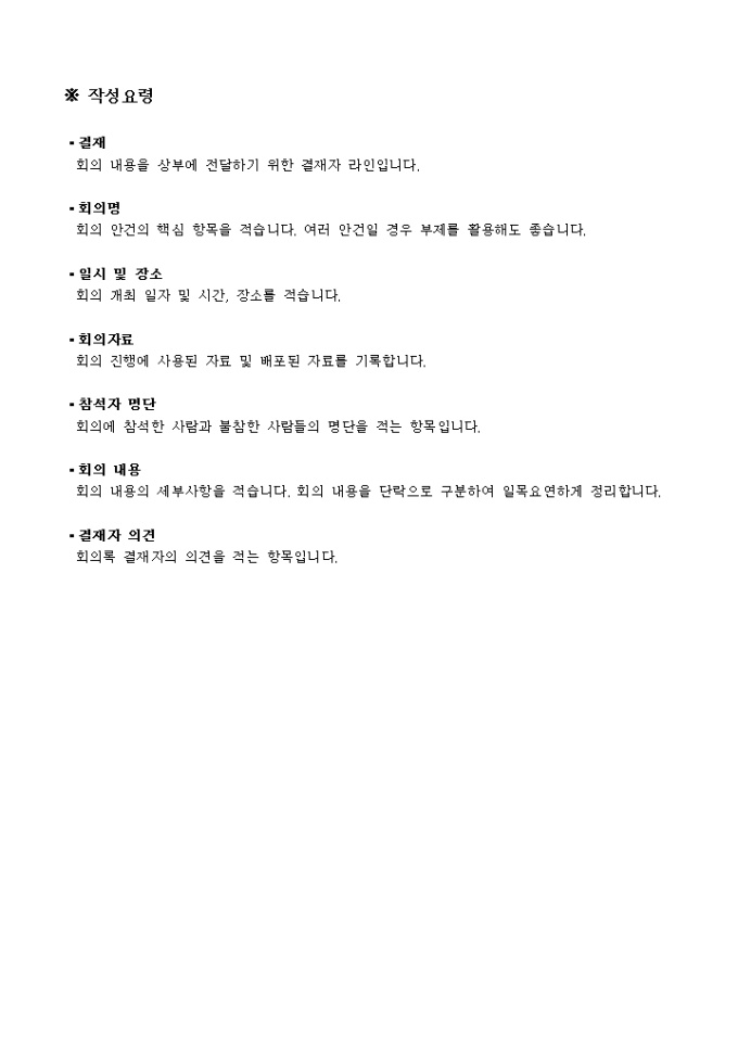 9,000원/월회의에서 나온 사항에 대하여 기록하기 위한 회의록 양식으로 작성법도 포함되어 있습니다.