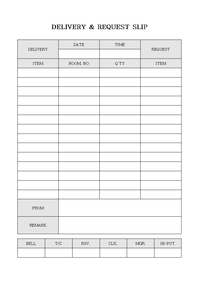 DELIVERY & REQUEST SLIP(영문) 양식으로 배달 항목, 객실번호, 수량, 요청 항목 등의 내용을 기재할 수 있습니다.