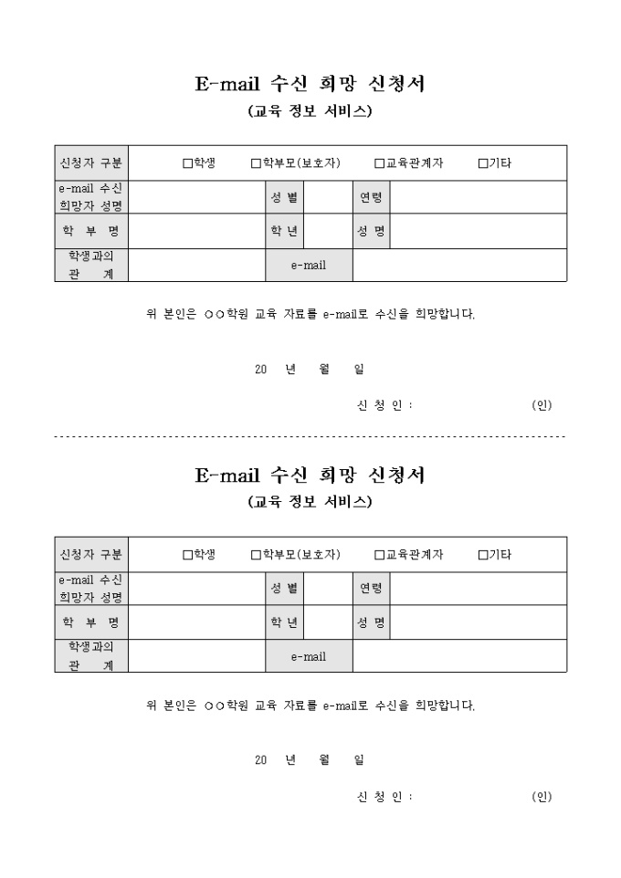9,000원/월2부로 나누어 사용이 가능한 교육 정보 서비스의 E-mail 수신을 희망할 때 사용하는 수신 희망 신청서입니다.