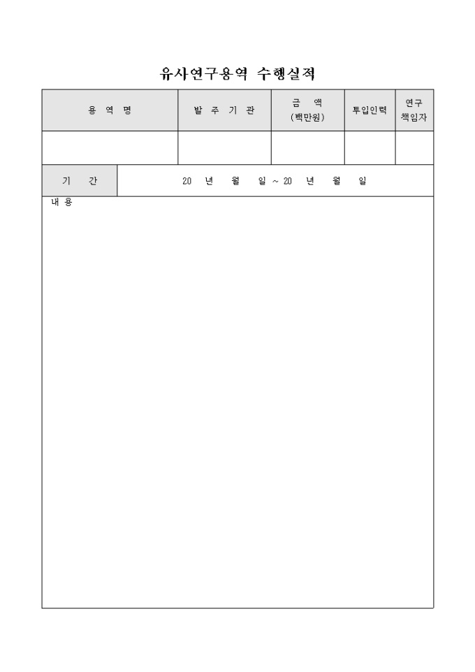 9,000원/월산학연 진행과정에서 관련 주제와 유사한 연구용역의 수행실적을 기재하여 주최측에 제출할 수 있게끔 제작된 서식입니다.