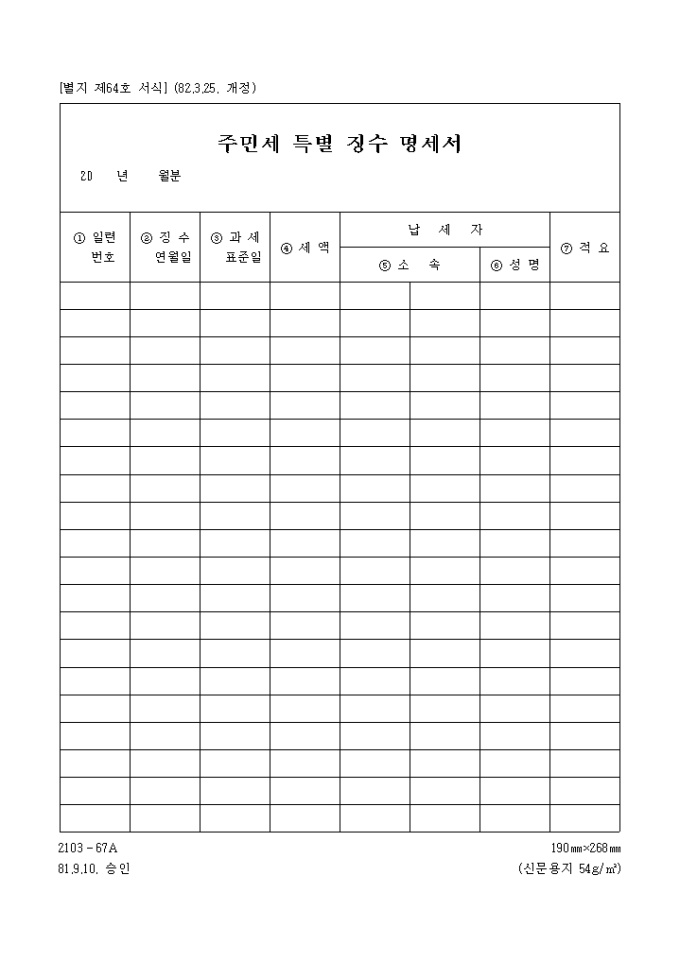 9,000원/월[별지 제64호 서식] 주민세특별징수명세서 양식입니다. 일련번호, 징수, 과세표준일, 세액, 납세자, 적요의 항목으로 구성된 양식입니다.