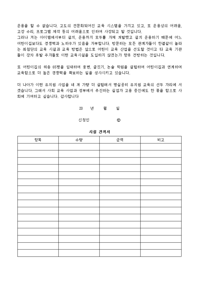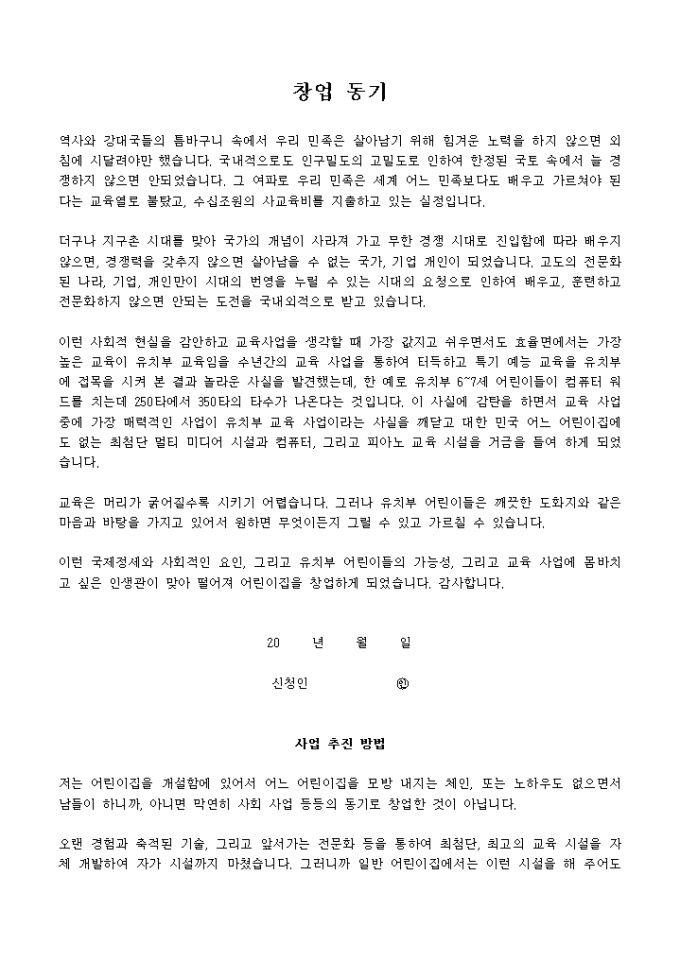 9,000원/월유치원 창업에 대한 동기를 기록한 양식입니다. 사업추진방법, 시설 견적서 등이 기재되어 있습니다.