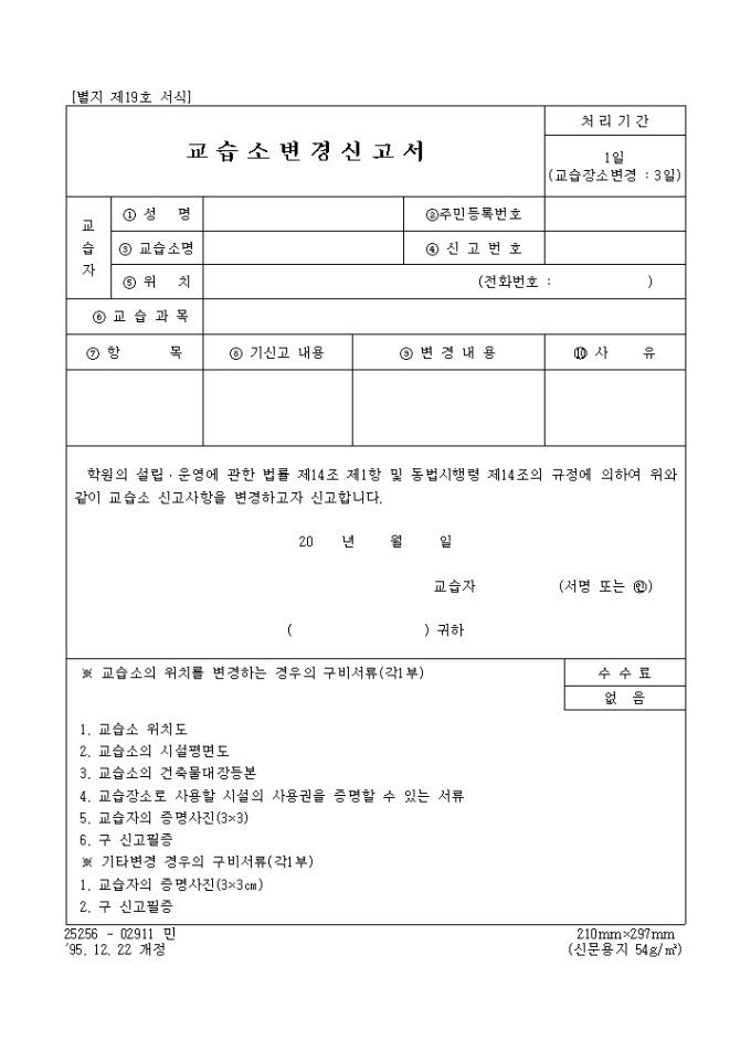 9,000원/월학원의 설립 운영에 관한 법률 제14조 제1항 및 동법시행령 제14조의 규정에 의하여 위와 같이 교습소 신고사항을 변경할 때 사용하는 양식입니다.