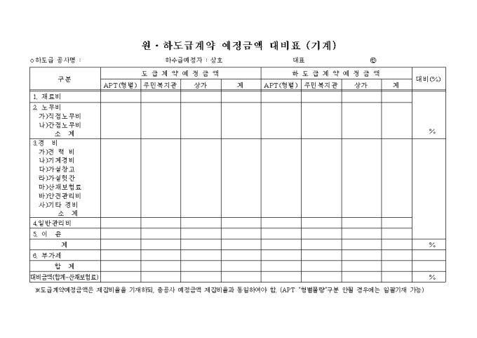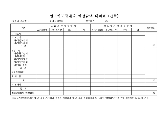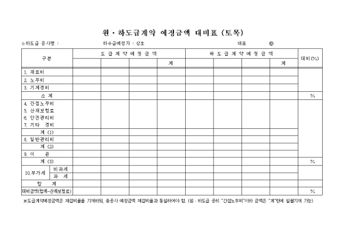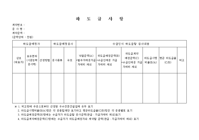 9,000원/월부대입찰시첨부양식 입니다. 하도급예정자, 하도급예정공사, 수급인이 하도급할 공사 내용의 세부 항목으로 구성된 양식입니다.