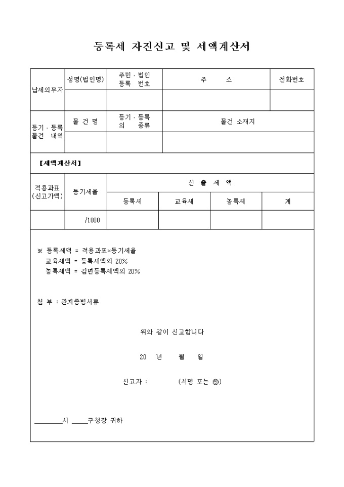 9,000원/월등록세자진신고및세액계산서 양식입니다. ※ 등록세액 = 적용과표×등기세율 교육세액 = 등록세액의 20% 농특세액 = 감면등록세액의 20% 첨 부 : 관계증빙서류 위와 같이 신고합니다 ...