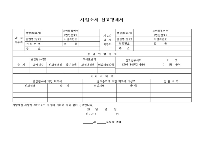 9,000원/월사업소세신고명세서 양식입니다. 지방세법 시행령 제213조의 규정에 의하여 위와 같이 신고하실때 사용하는 양식입니다.