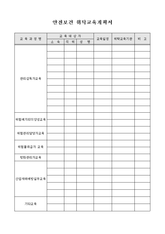 9,000원/월회사에서 안전보건에 대하여 위탁교육을 실시하기 위해 작성하는 안전보건 위탁교육계획서 양식입니다. 교육과정별로 교육대상자의 소속, 직위, 성명, 교육일정, 위탁교육기관 등의 항목을 작성할 수 있습니다.