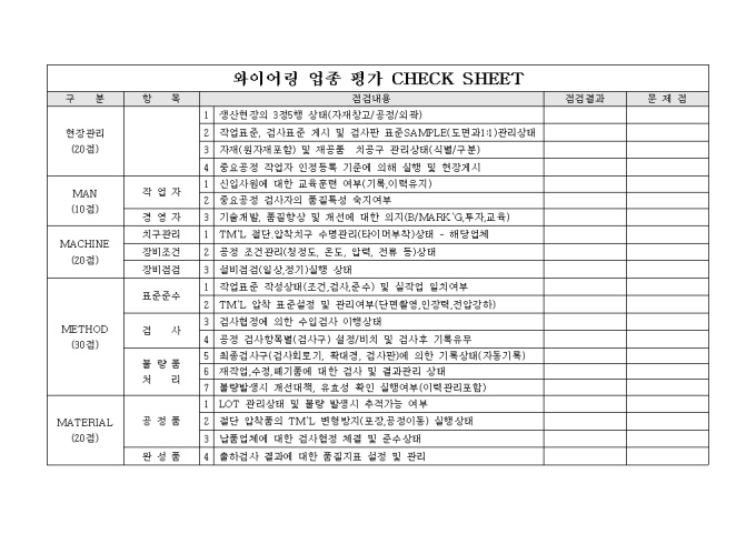 9,000원/월와이어링 업종의 작업별 점검내용을 기록하고 결과 및 문제점등을 기록 할 수 잇는 업종 평가 시트 입니다.