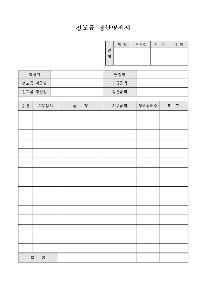 9,000원/월사업장의 운영에 있어 편의를 위해 사전에 먼저 금액을 지급하고 추후에 정산하는 전도금에 대한 정산 명세서 양식입니다. 전도금의 지급일, 지급금액, 정산일, 정산금액 과 각 품목별 사용일시, 사용금액 등의 내용을 기재할 수 있습니다.