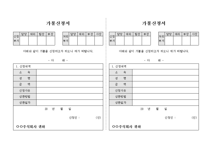 9,000원/월회사에서 해당 사유로 인하여 가불을 해야할 경우 작성하는 가불신청서 양식입니다. 가불을 신청하는 사람의 소속, 성명, 금액, 신청사유, 상황방법, 상환일자 등을 기재할 수 있으며, 가불신청서 양식이 2부로 구성되어 있습니다.