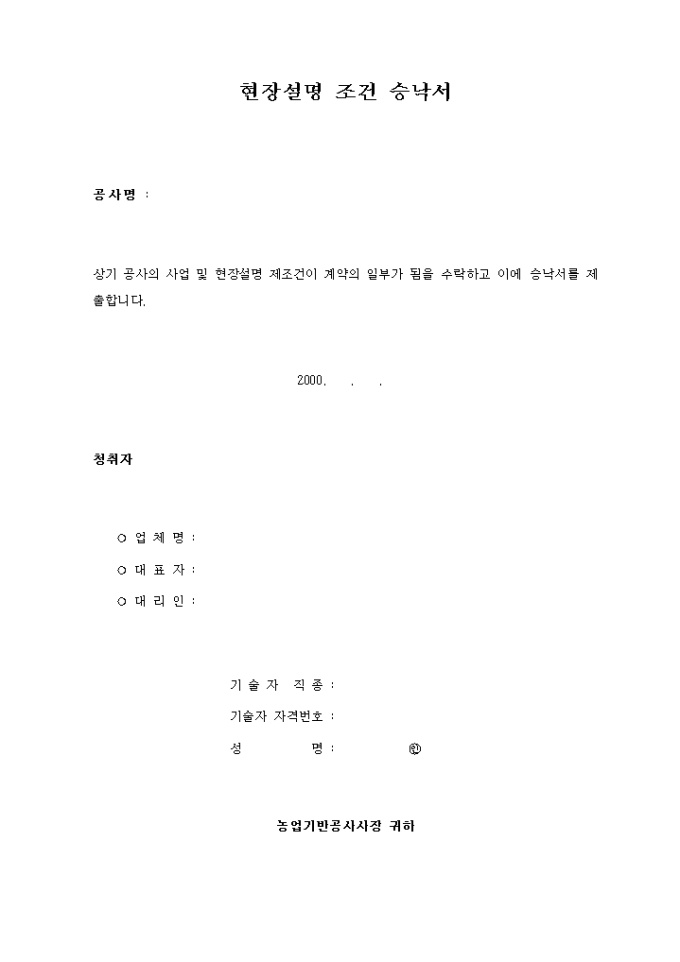 9,000원/월공사의 사업 및 현장설명 제조건이 계약의 일부가 됨을 수락할 때 사용하는 양식입니다.