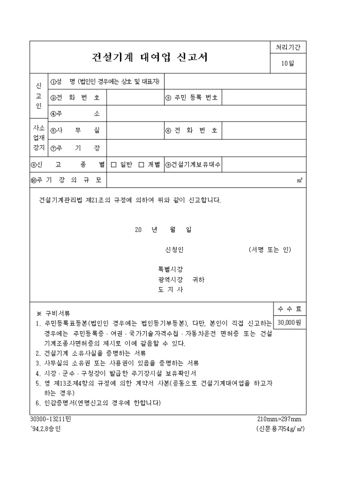 9,000원/월건설기계관리법 제21조의 규정에 의하여 건설기계 대여업 신고를 할 때 사용하는 양식입니다.
